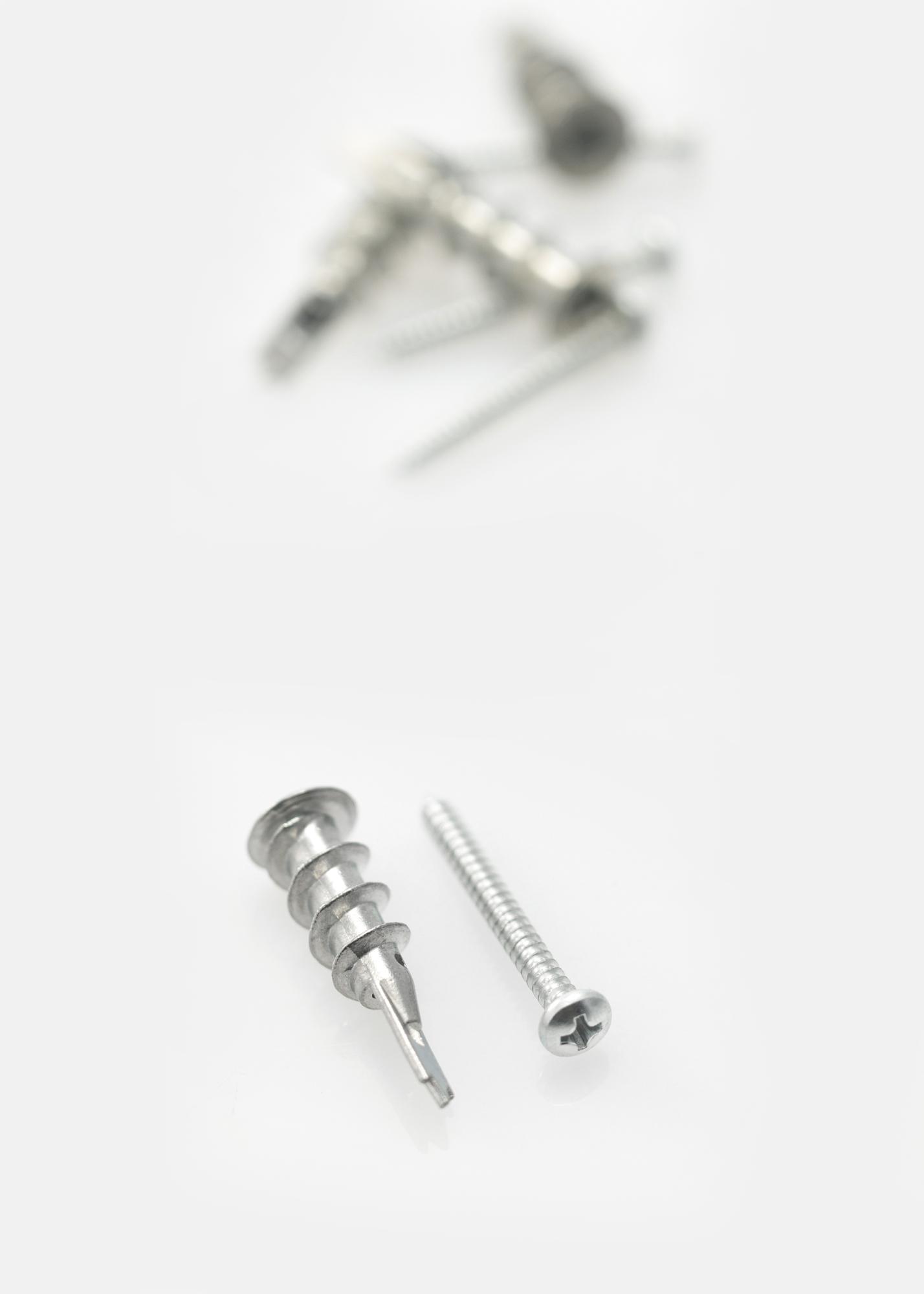 Zelfborende pluggen en schroeven in 4-pack. Schroef de plug in de wand en dan de schroef en dan ben je klaar. Je hoeft niet te boren. Past perfect bij al onze lijsten voor aan een gipsmuur.