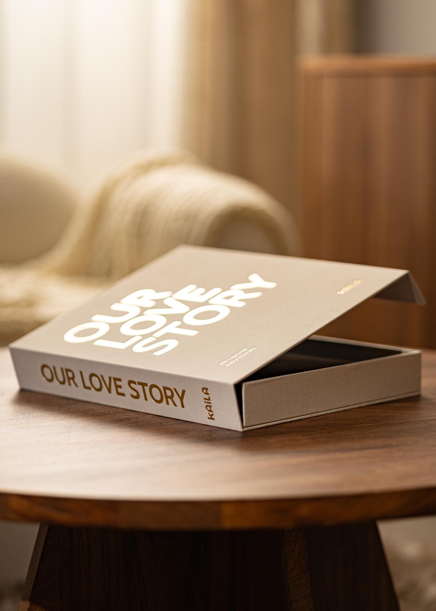 Dit is een fotoalbum en een salontafelboek in één wat tegelijkertijd een mooi decoratief interieurdetail in je huis zal zijn. Het fotoalbum is ontworpen als een met stoffen bekleed exclusief boek en heeft een mooie manilla kleur. Op de voorkant van het fotoalbum staat de titel ”OUR LOVE STORY” gedrukt in gouden hoofdletters en heeft de ondertitel ”We captured every moment” wat dit album perfect maakt voor het bewaren van mooiste herinneringen aan je dierbaren, of om weg te geven als een leuk cadeau. Waarom bewaar je geen mooie trouwfoto's in dit elegante fotoalbum? Wanneer je het album opent, word je verwelkomt door een mooie en discrete print aan de binnenkant van de omslag en een ringband met 30 zwarte vellen (60 pagina's) die je kunt vullen met mooie fotoherinneringen. Je plakt je foto's zelf, waardoor je ruimte hebt voor zowel flexibiliteit als creativiteit.