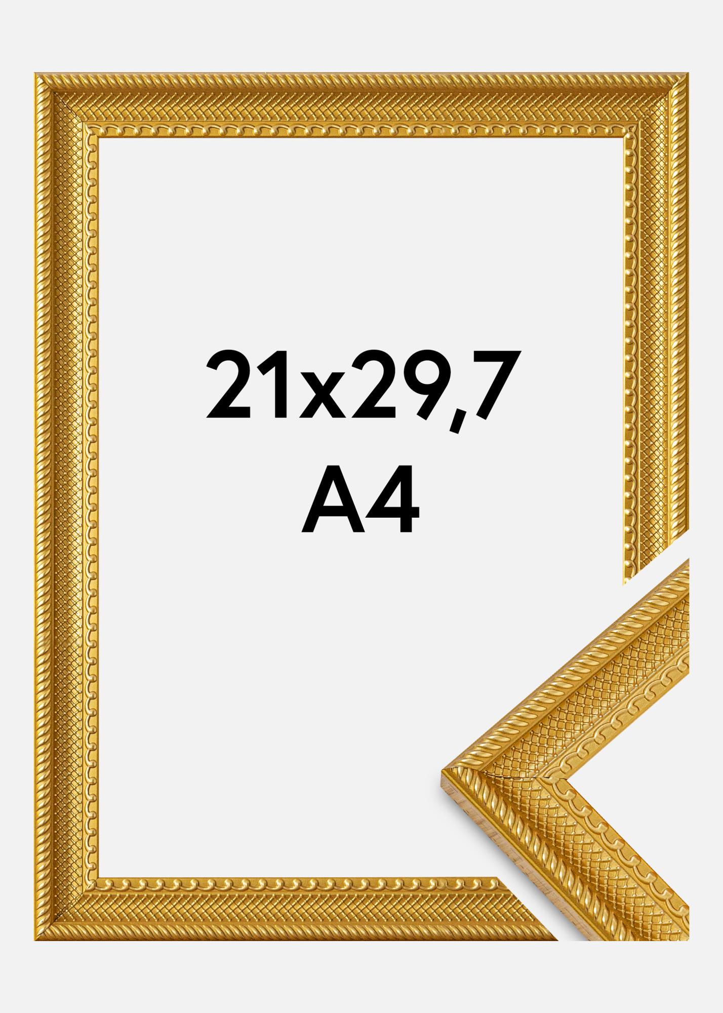 Deze elegante fotolijst in goud is een perfecte combinatie van klassiek design en moderne functionaliteit. Met zijn gedetailleerde patronen langs de randen en een glanzende afwerking, geeft het een luxe gevoel dat elk kunstwerk of foto verbetert. De lijst is gemaakt van composietmateriaal, wat het zowel sterk als licht maakt. Het is ontworpen om te passen bij motieven in de maat 21x29,7 cm (A4), wat het ideaal maakt om je favoriete herinneringen op een stijlvolle manier te laten zien.