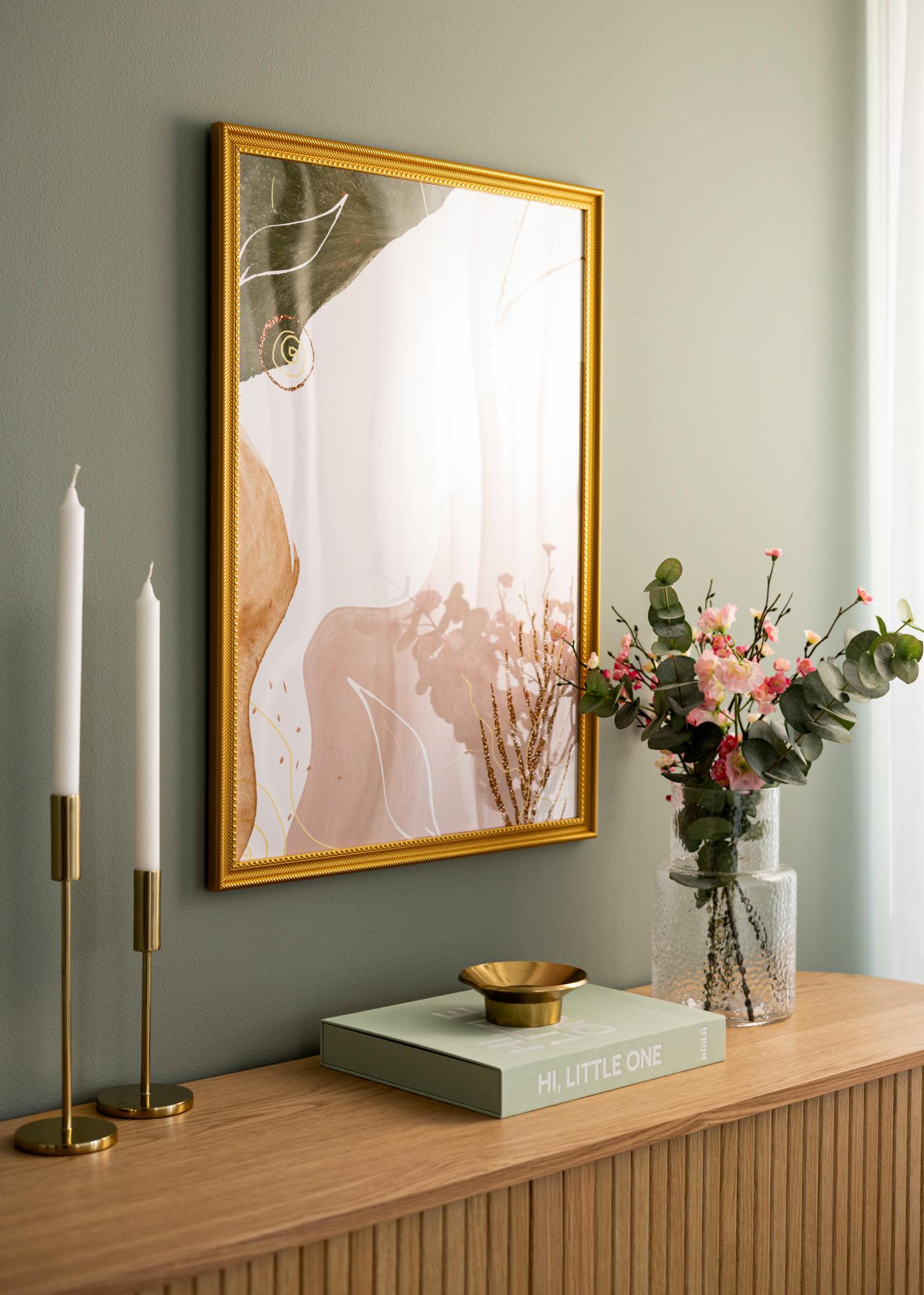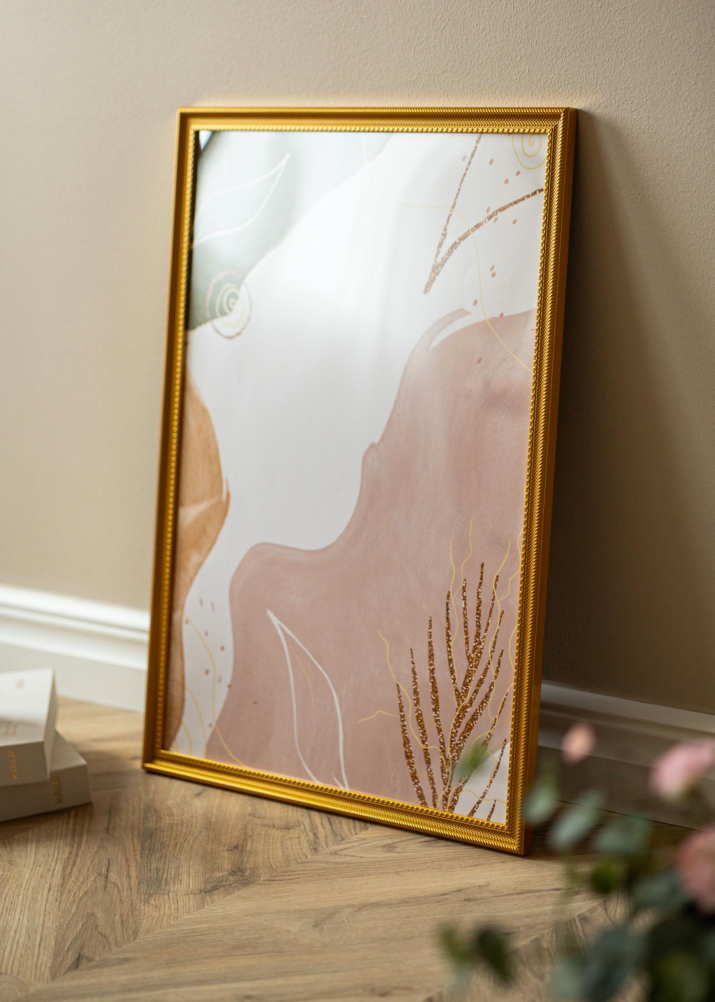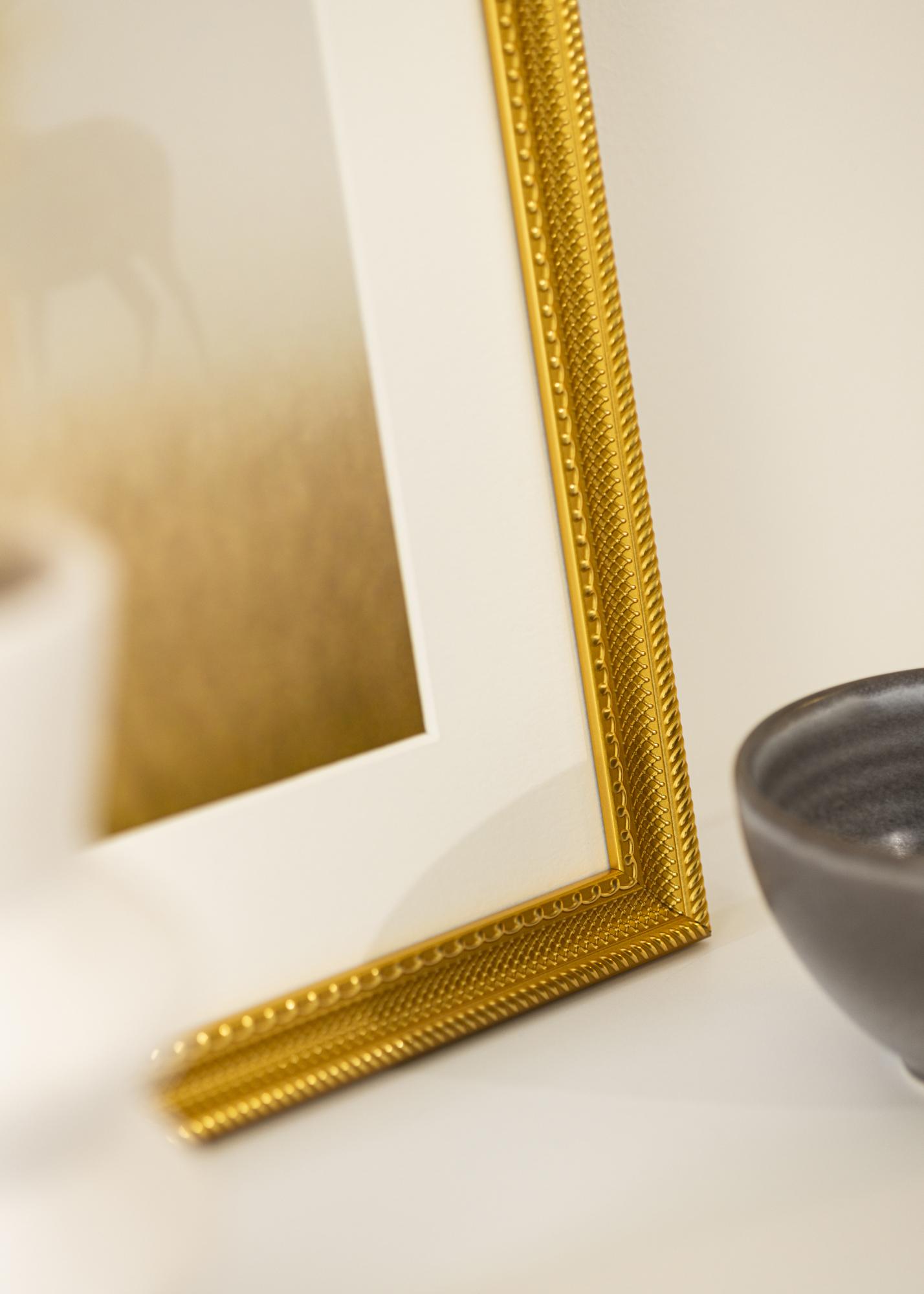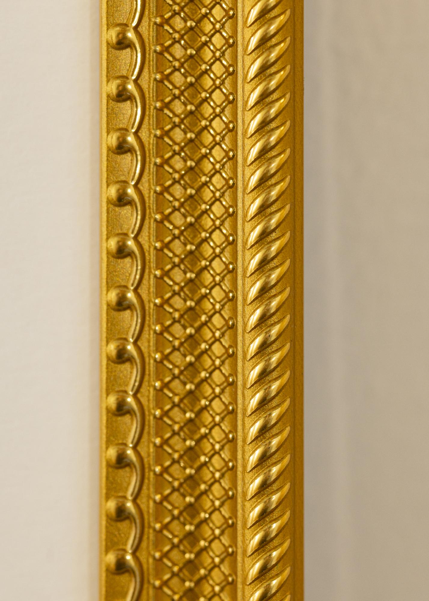 Deze elegante fotolijst in goud is een perfecte combinatie van klassiek design en moderne functionaliteit. Met zijn gedetailleerde patronen langs de randen en een glanzende afwerking, geeft hij een luxe gevoel dat elk kunstwerk of foto versterkt. De lijst is gemaakt van composietmateriaal, wat het zowel sterk als licht maakt. Hij is ontworpen voor afbeeldingen in het formaat 40x60 cm, wat het ideaal maakt om je meest geliefde herinneringen tentoon te stellen.