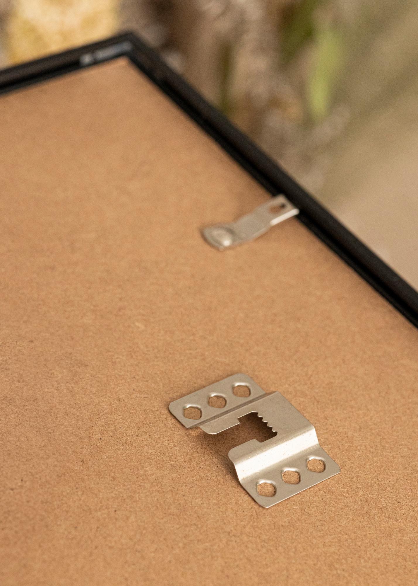 Op de achterkant van de lijst zijn wandbeugels bevestigd voor verticale en horizontale ophanging. Bij de kleinere maten fotolijsten zijn steunpoten inbegrepen, zodat je je kleine fotolijstjes ook op de boekenplank of op het bureau kunt plaatsen.