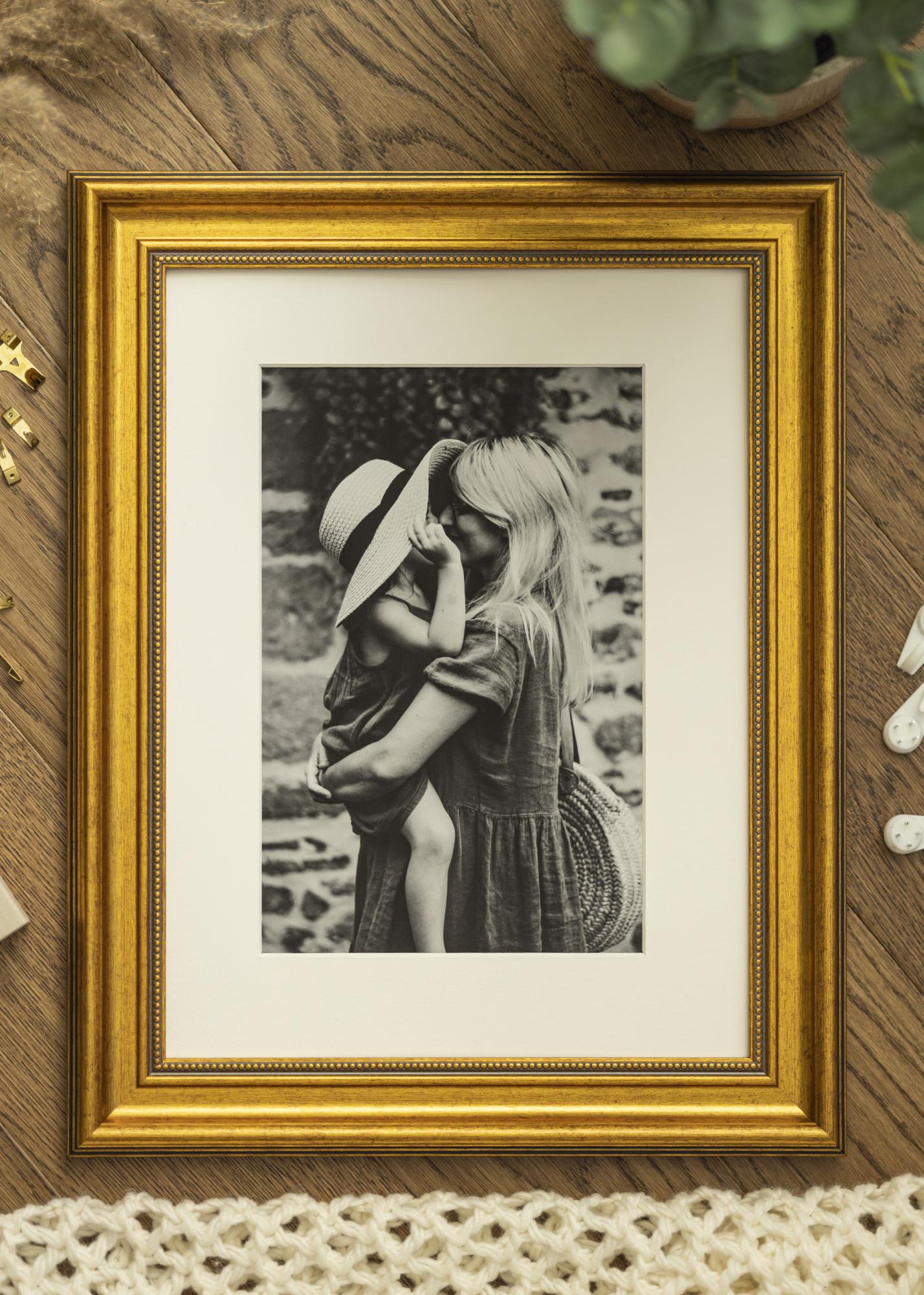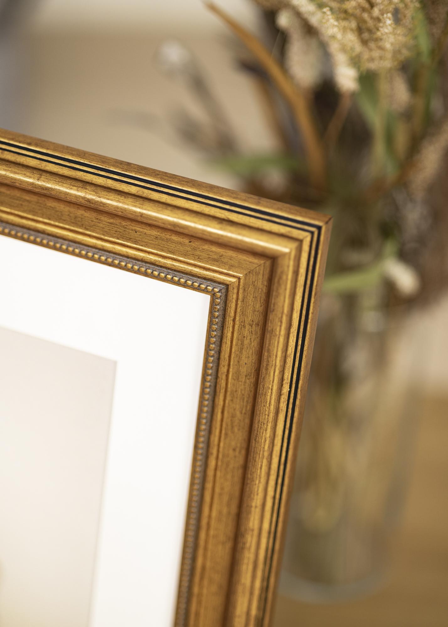 Rococo is een gouden lijst die een heerlijk vintage gevoel geeft aan al je favoriete motieven. De lijst heeft een 50 mm brede lijst in tinten van glanzend antiekgoud, en een prachtig versleten oppervlak dat het klassieke uiterlijk van de lijst versterkt. De lijst is geschikt voor persoonlijke foto's evenals voor abstracte posters – en welk motief je ook kiest, je kunt het zonder problemen monteren. Haal gewoon de achterkant van de lijst los, die op zijn plaats wordt gehouden door kleine buigbare pinnen, en plaats dan je wandkunst naast het glas van de lijst.