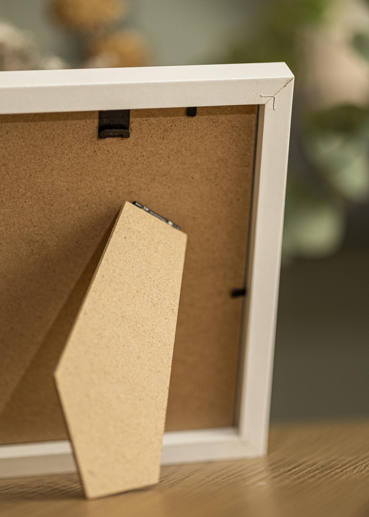 Het frame is 18 mm breed en 18 mm diep. De witte kleur van de lijst past goed bij de meeste afbeeldingen en is ook gemakkelijk te combineren met de rest van je interieur. De achterkant van de lijst wordt op zijn plaats gehouden met kleine metalen clips. Door de clips omhoog te buigen, kan de achterkant los gemaakt worden en kan de afbeelding eenvoudig in het frame geplaatst worden. Aan de achterkant van de fotolijst zit handige wandbevestiging waarmee je de lijst zowel verticaal als horizontaal kunt ophangen.