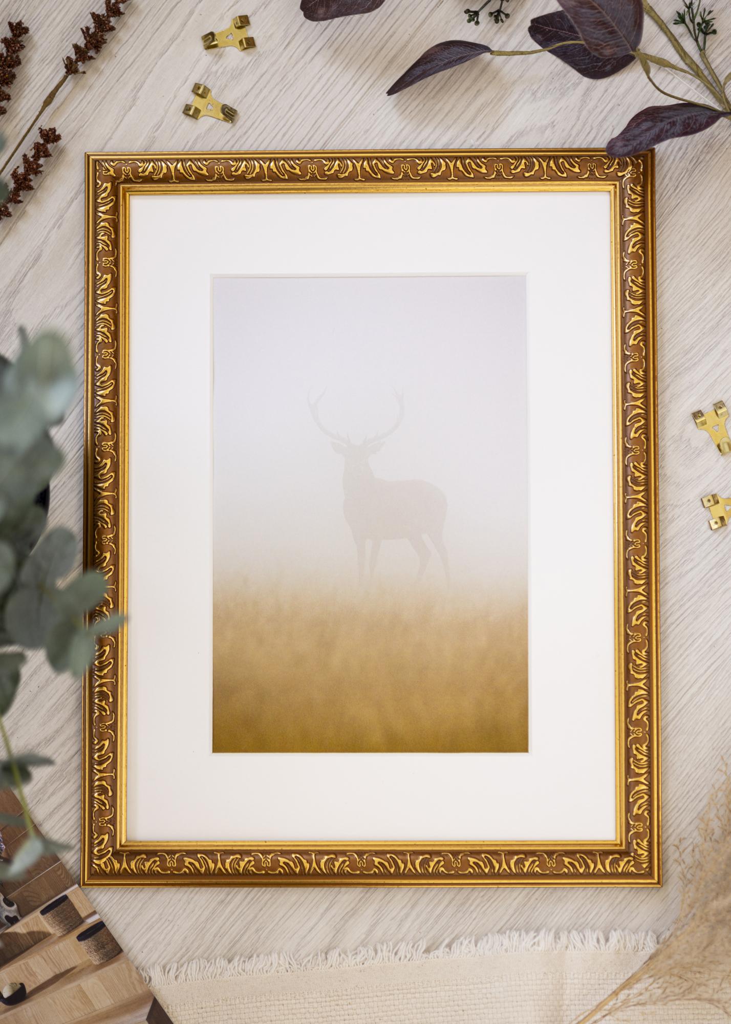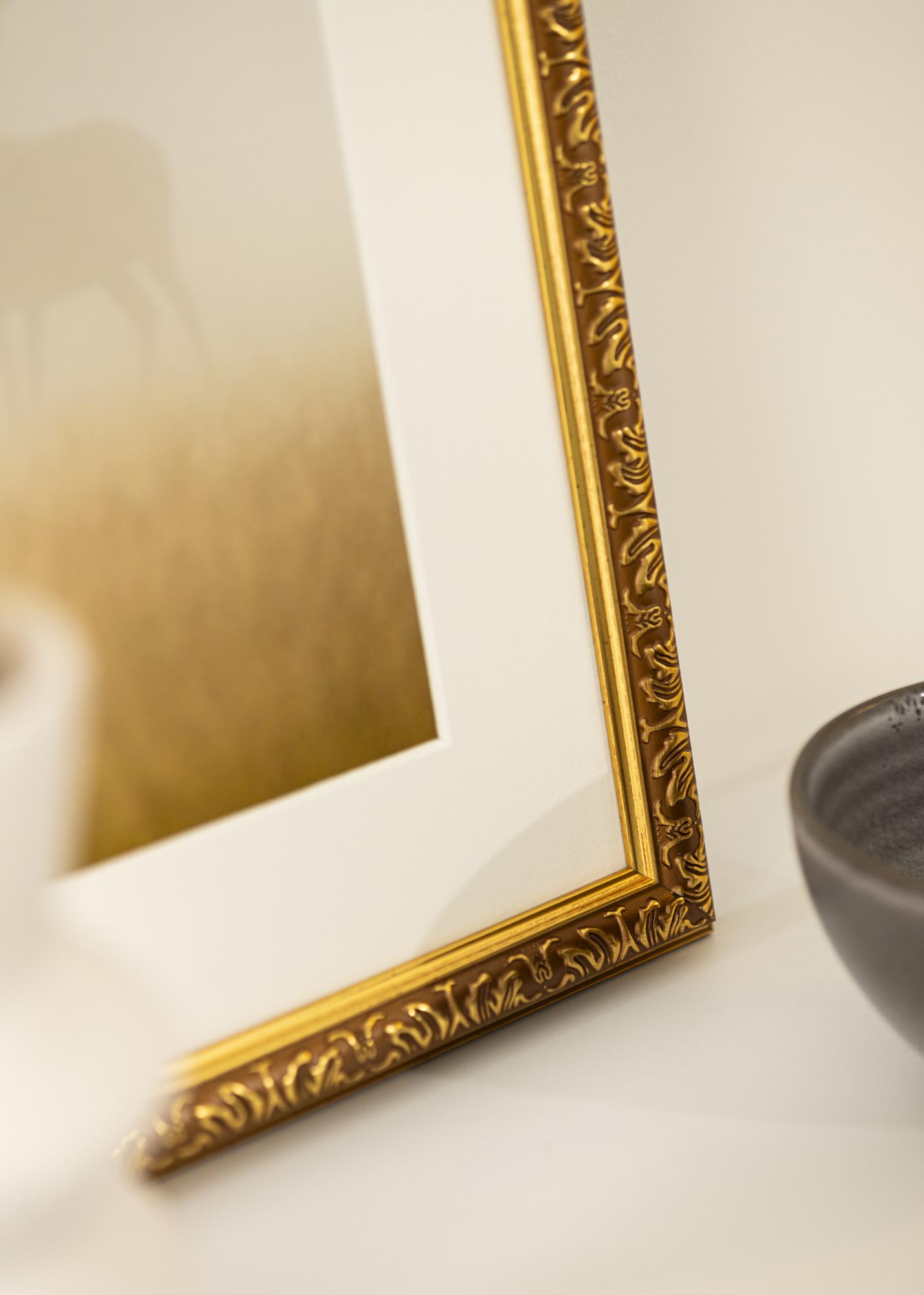 Deze fotolijst in het formaat 40x50 cm is een perfecte combinatie van klassiek design en moderne functionaliteit. Met zijn luxueuze goudafwerking en decoratieve, geornamenteerde details, geeft hij een verfijnde touch aan elke kamer. De ingewikkelde patronen langs de binnenrand van de lijst creëren een traditionele en tijdloze sfeer, waardoor hij ideaal is voor het omlijsten van zowel kunstwerken als foto's.
