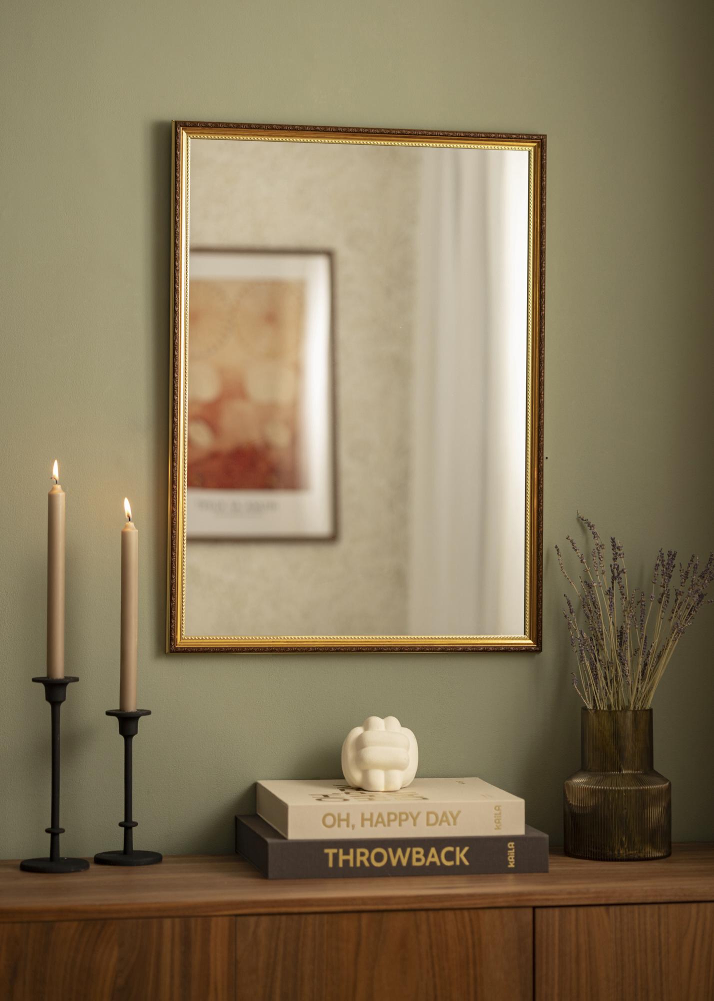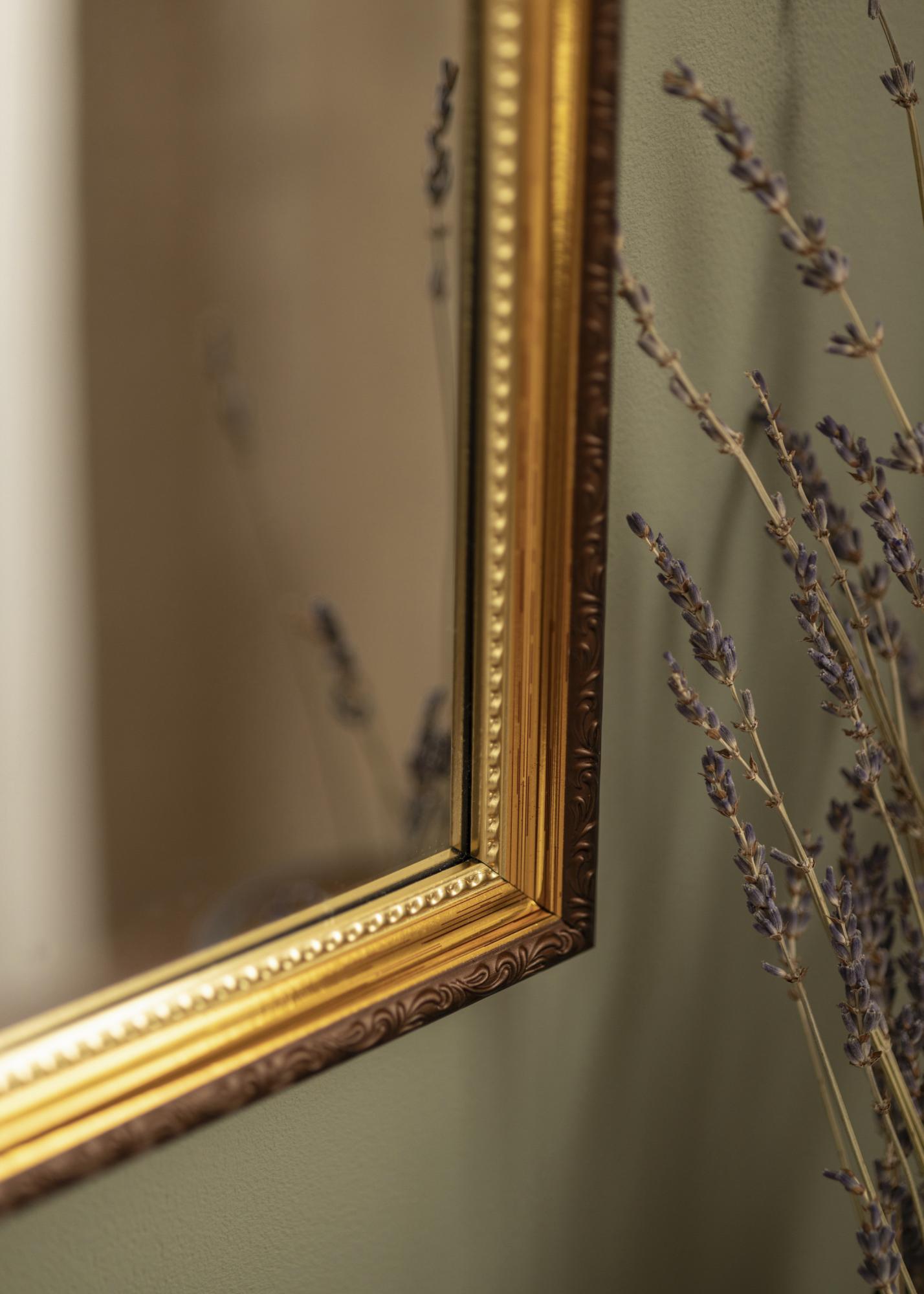 Abisko Goud is een wandspiegel voor wie op zoek is naar een decoratieve spiegel met een elegante retro-geïnspireerde look. De spiegel heeft een 25 mm breed frame met een bruine kleur en een exclusieve gouden kleur rondom het spiegelglas. Het frame heeft een prachtig versierd profiel, waardoor de muurspiegel een zeer stijlvolle wanddecoratie is die zowel in gangen als slaapkamers goed tot zijn recht komt.
