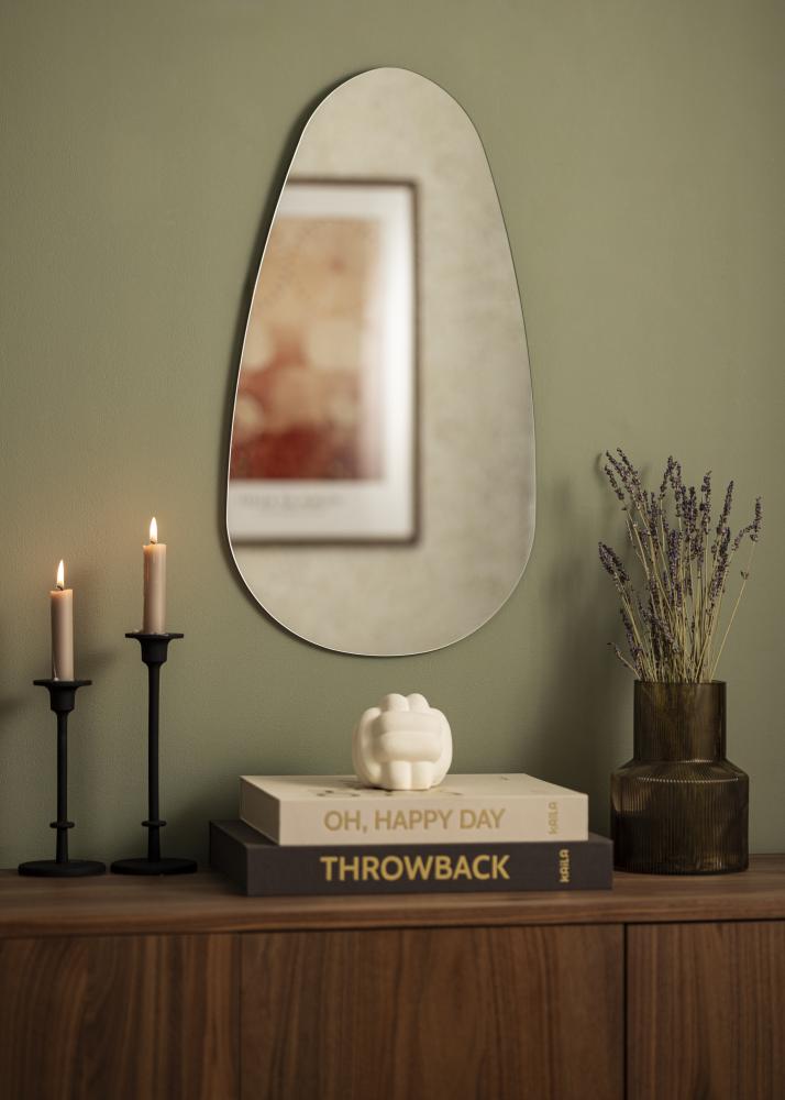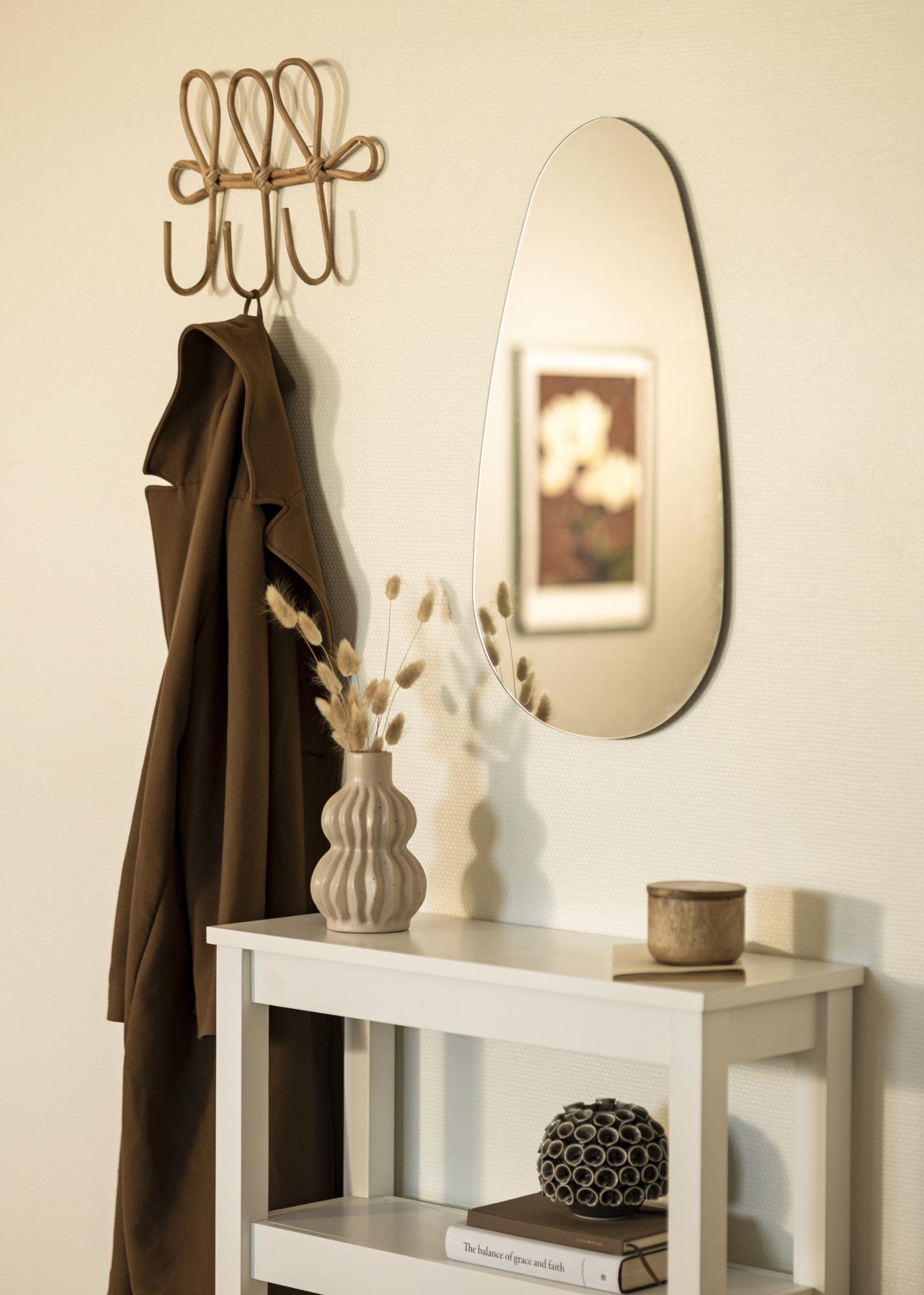 Deze spiegel is niet alleen een praktisch detail, maar ook een decoratief stuk dat je interieur aanvult. Zijn elegante druppelvormige silhouet strekt zich zachtjes naar boven uit, wat een gevoel van rust en schoonheid in de kamer creëert. Hij is ontworpen om zowel staand als liggend opgehangen te kunnen worden, waardoor je de flexibiliteit hebt om hem aan te passen aan je ruimte en persoonlijke stijl.