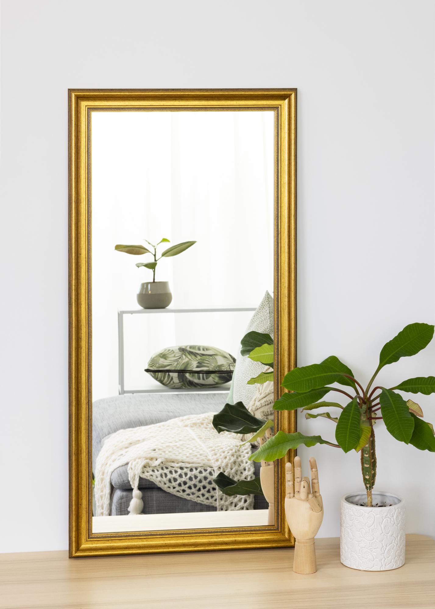 Deze rechthoekige spiegel heeft een prachtige goud gekleurde frame in klassieke stijl. De spiegel heeft een warm en elegant uiterlijk en kan bijna elke kamer dan ook mooi decoreren.