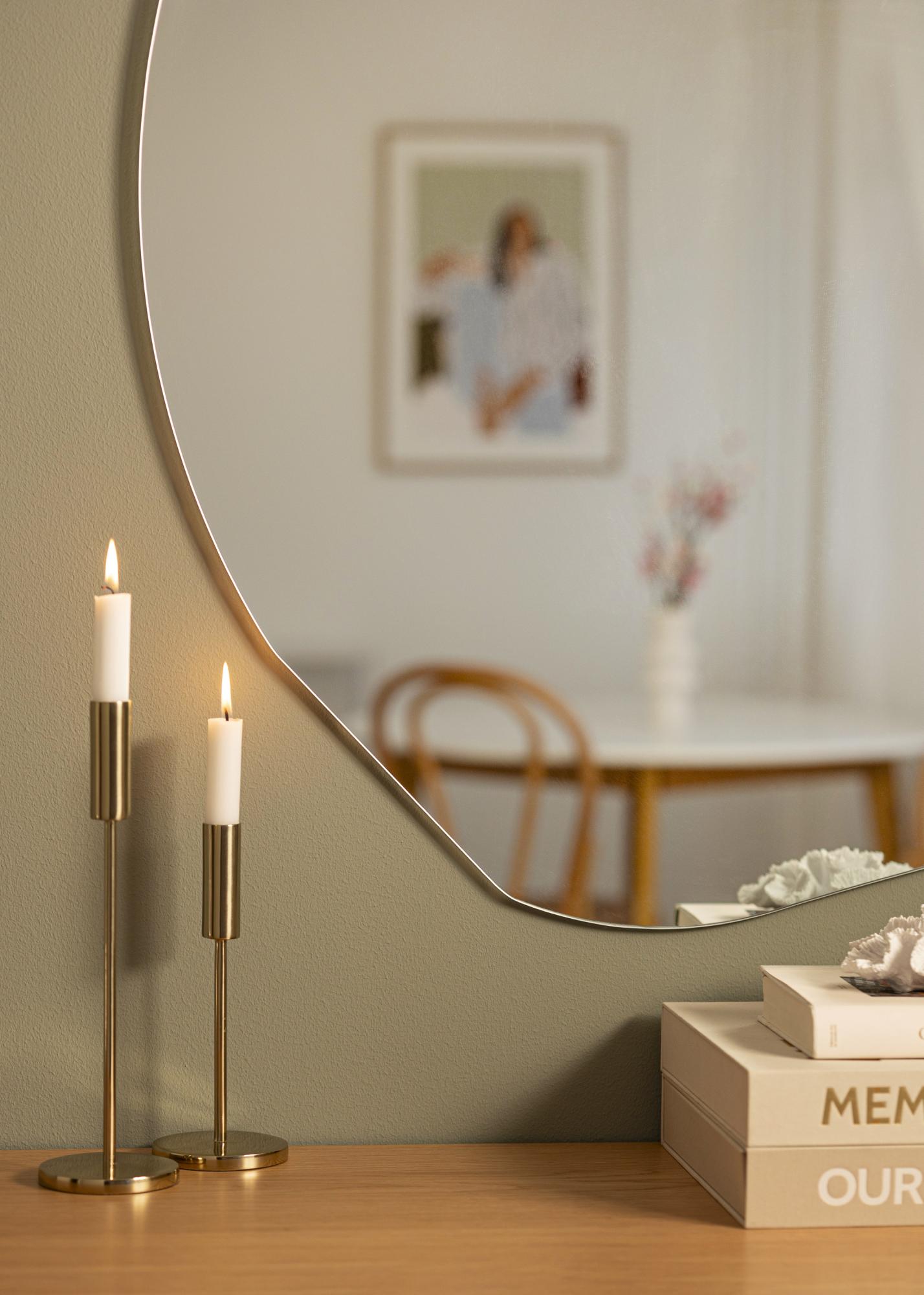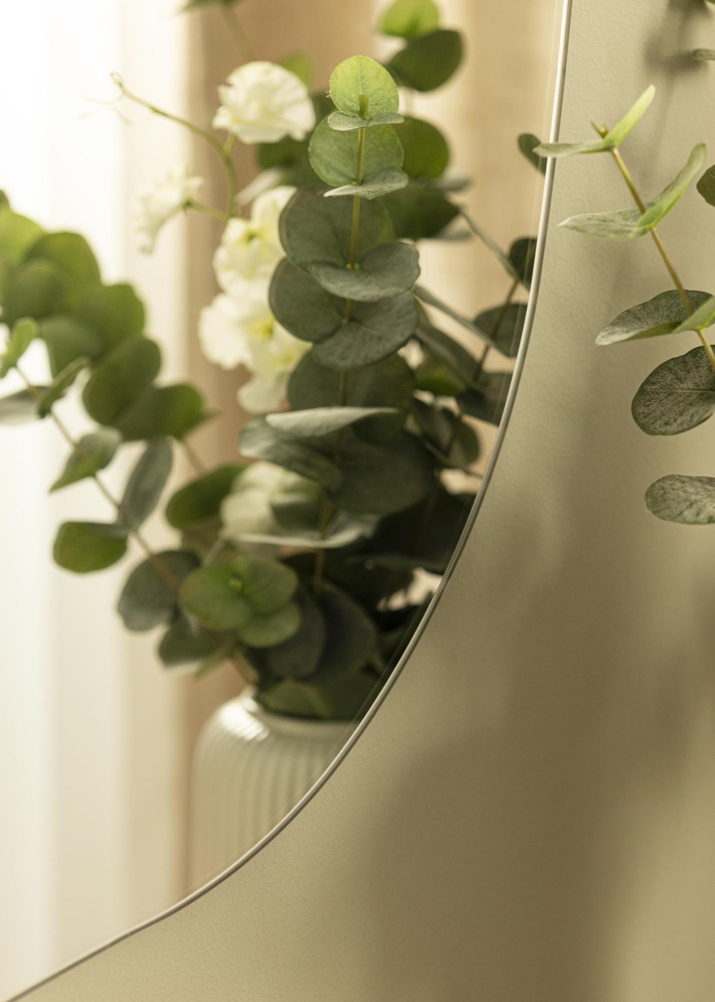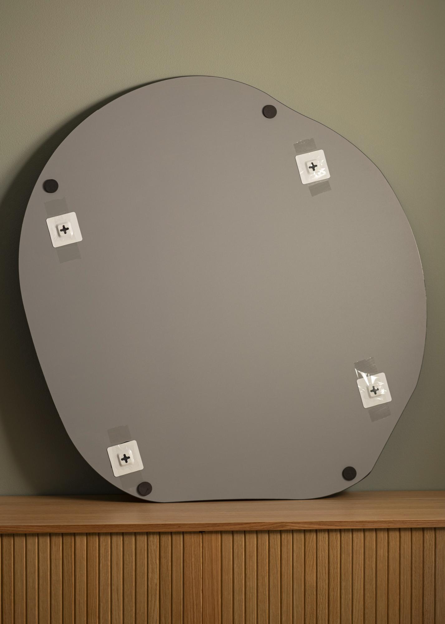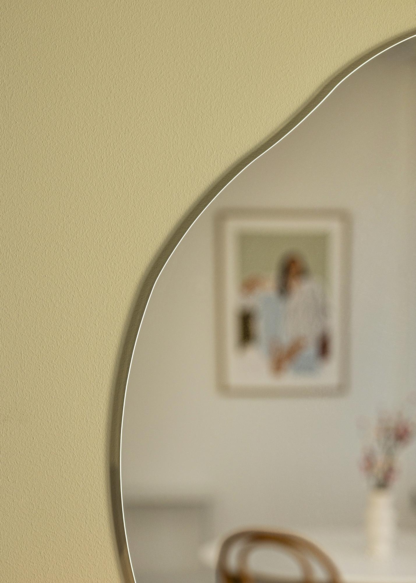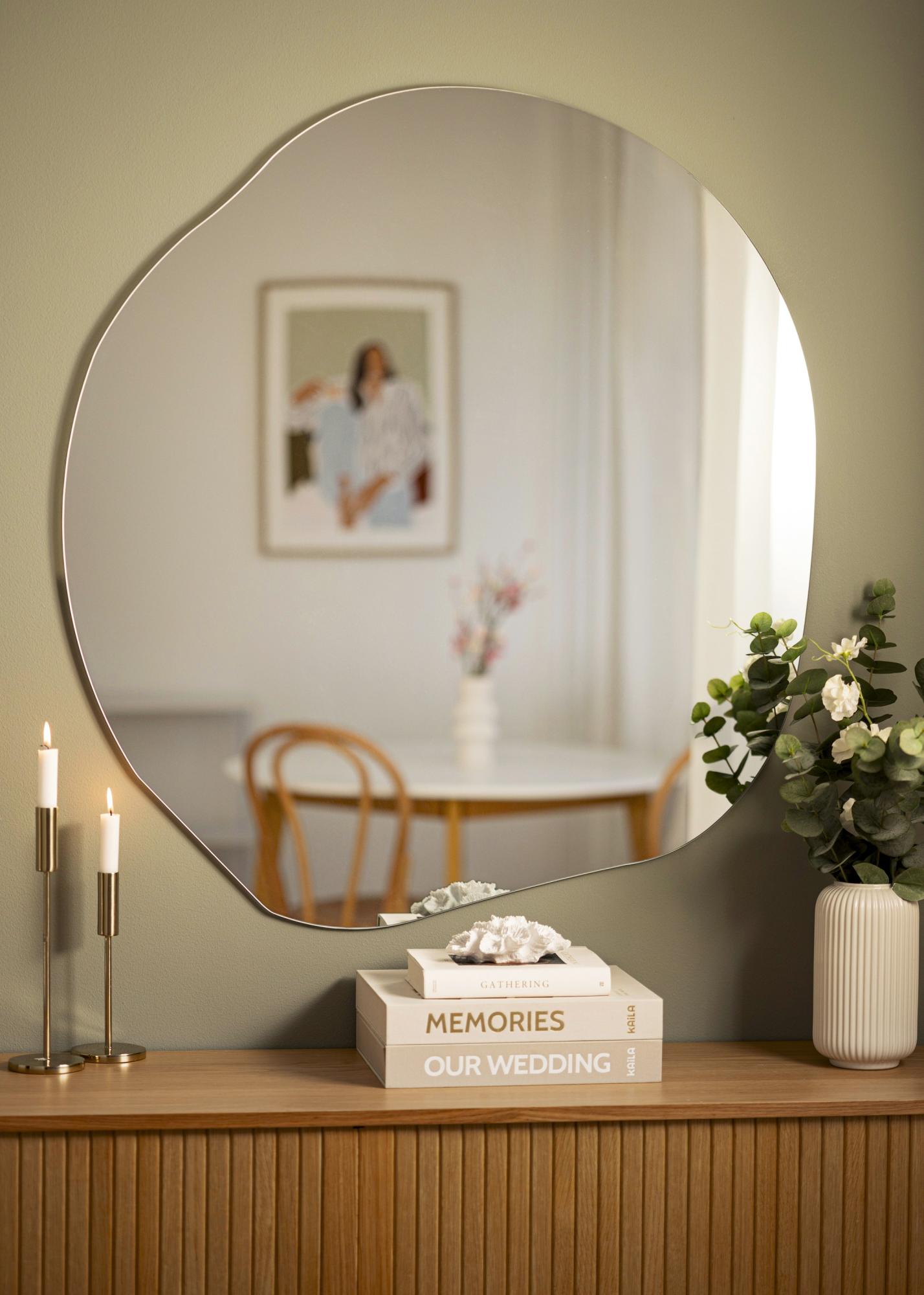 De spiegel heeft een rond, bijna organisch ontwerp met zachte, vloeiende lijnen die zorgen voor een ontspannen en uitnodigende sfeer. Dit ontwerp maakt van de spiegel een natuurlijke blikvanger in de kamer en voegt elegantie en zachtheid toe aan uw interieur.